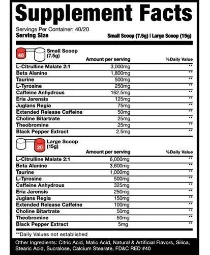 Pre-entreno ultra potente con alta dosis de estimulantes, diseñado para proporcionar energía, enfoque y bombeo muscular.